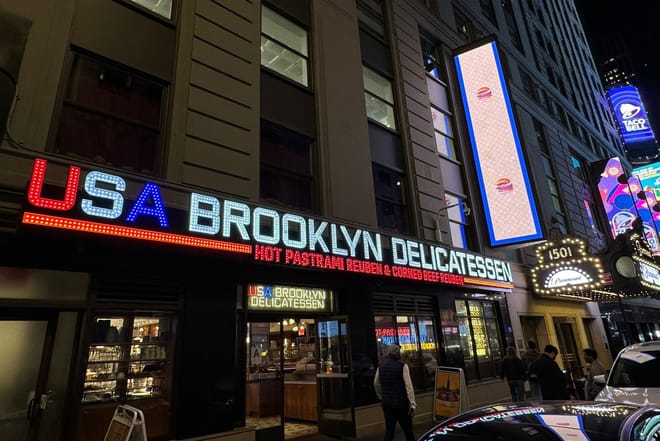 Enjoy a light breakfast or a sweet treat at Brooklyn Delicatessen just off Times Square. Choose between a croissant with coffee or a cookie with hot chocolate. Perfect for a quick bite.
