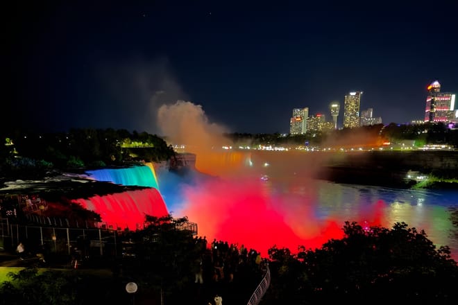 Highlights Watch Niagara Falls sparkle in a rainbow of colors after dark Stroll with your guide to the park’s most enchanting viewpoints Feel the magic of fireworks lighting the night sky in summer Choose 60 or 90 minutes for a dreamy walk by the waterfalls Add Maid of the Mist for a day-to-night adventure to remember Experience Niagara Falls like never before—after dark! Enjoy viewpoints from Niagara Falls State Park, USA of the American, Bridal Veil & Horseshoe Falls as they come alive in a range of brilliant colors, glowing under 1,400 LED lights. Follow your expert guide on a small group walking tour to the park’s best viewpoints as they unveil the Fall’s unique history and geology. In summer, your evening ends with a dazzling fireworks display exploding above the illuminated Falls. Choose a 60-min tour to see American & Bridal Veil Falls, or upgrade to 90-min for close-up views of the Horseshoe Falls too. Either way, you’ll witness a spectacular side of Niagara few ever forget. For the ultimate day-to-night adventure, add a Maid of the Mist boat ride earlier in the day. Feel the mist on your face as the boat glides past the American and Bridal Veil Falls, then into the heart of the thundering Horseshoe Falls—an experience you’ll never forget.