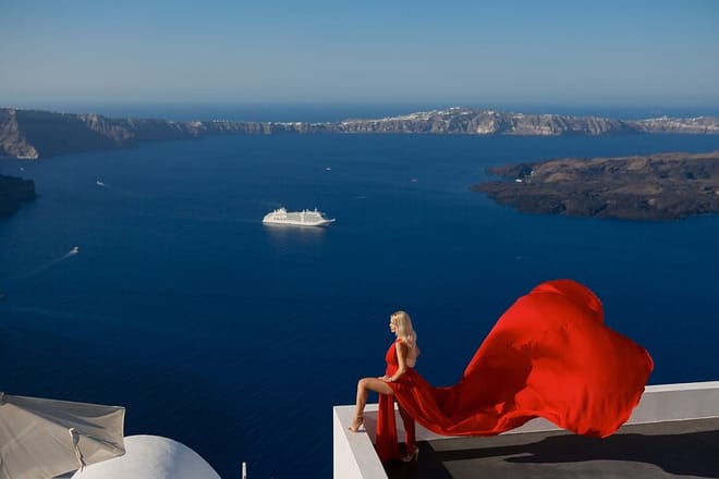 A Professional and Personal Travel Photographer with Flying Dress experience in Santorini