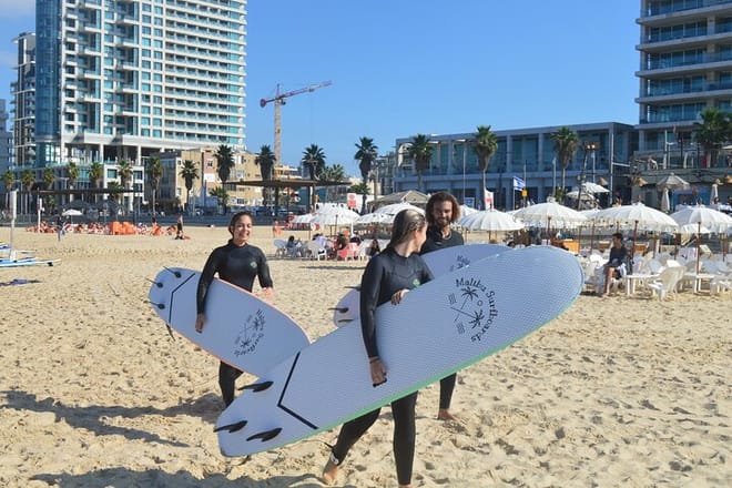 Highlights Learn to surf with confidence from a certified expert instructor Enjoy an unforgettable surf adventure against the stunning Tel Aviv coastline Use top-notch surfboards and wetsuits Ride the waves, feel the adrenaline, and make lasting memories Clean up in indoor or outdoor showers with private changing rooms Experience the thrill of riding the Mediterranean waves with a 1-hour surf lesson at Beach Club TLV. Located at the southern end of the promenade, this lesson is ideal for beginners & surf enthusiasts, offering expert instruction in a stunning beachfront setting. Upon arrival, you’ll meet your certified surf instructor who ensures a safe & fun experience. After a land demonstration covering techniques & safety, you’ll get soft-top surfboards & wetsuits if needed. Then, it’s time to hit the waves, where hands-on guidance will help you catch your first ride. Surfing is more than just a sport; it’s a freeing and energizing experience. Your instructor will help you progress while encouraging you to enjoy the journey. After the session, rinse off in indoor or outdoor showers, use private changing rooms, and capture the moment with optional souvenir photos.